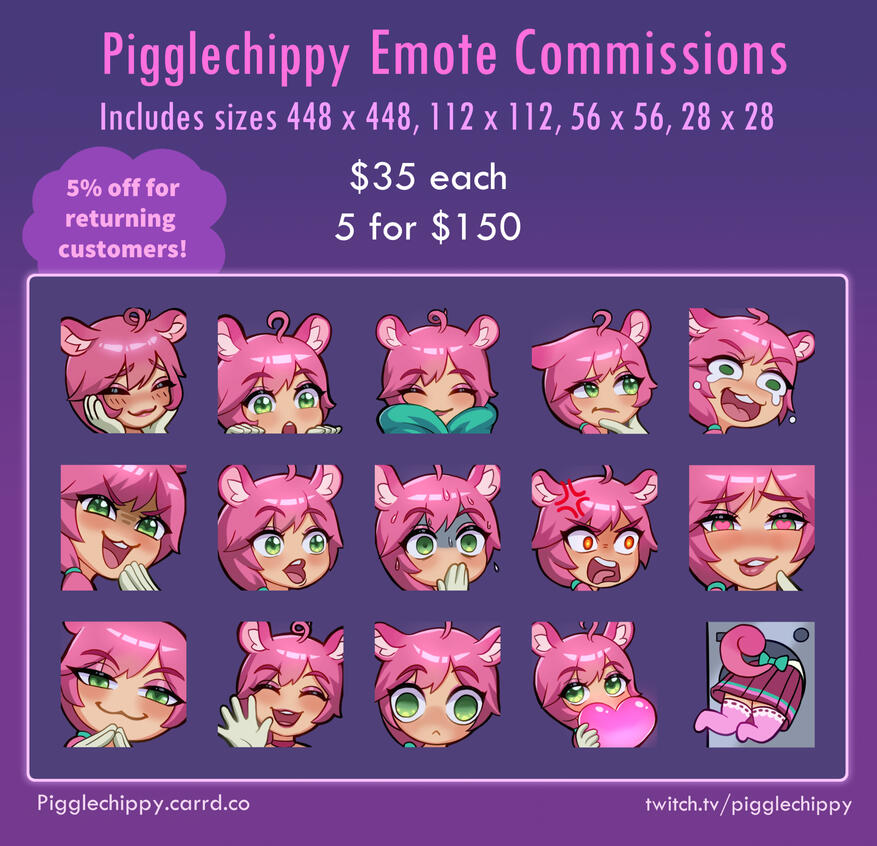 Thank you for checking out my commissions! I offer PNGtuber avatars, Twitch emotes, and character illustrations. More options will be available as time goes on. While you're here, check out my other socials right below!