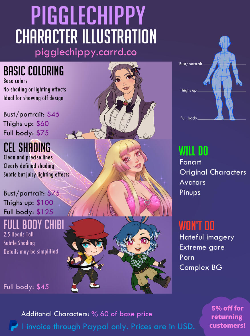 If the total price is at least $100 usd, you may choose to pay half up front, and half when finished. The unwatermarked, fully sized image will be given once the commission is paid in full. Otherwise, payment is all up front.